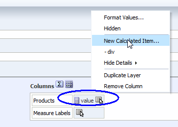 Now for the “value” column I added a “New Calculated Item” I named ‘div”: